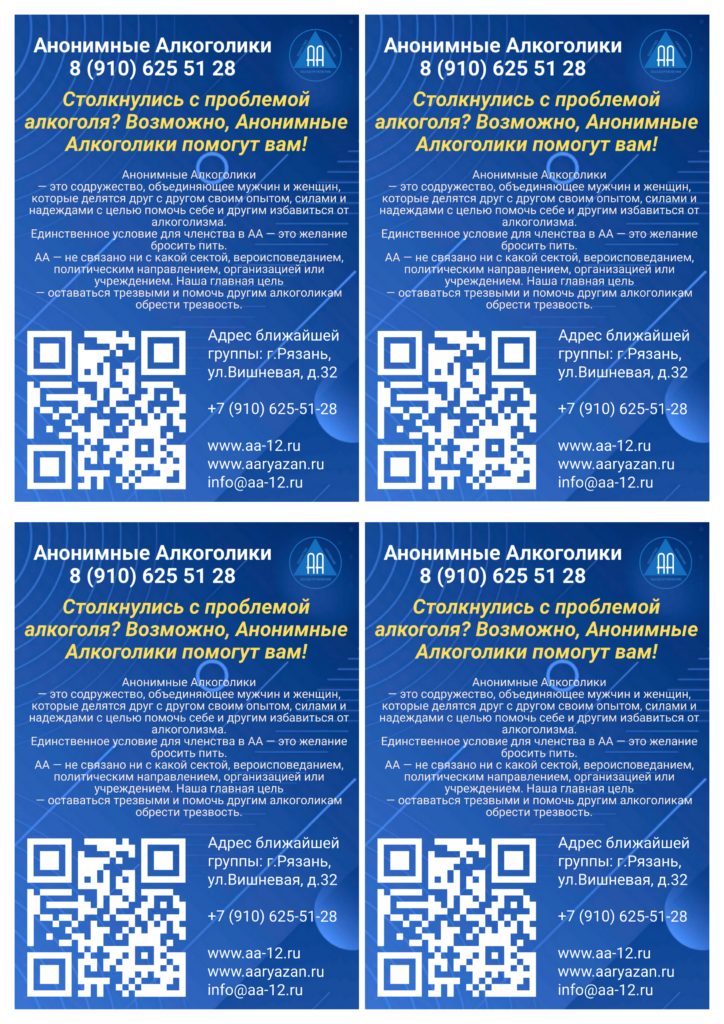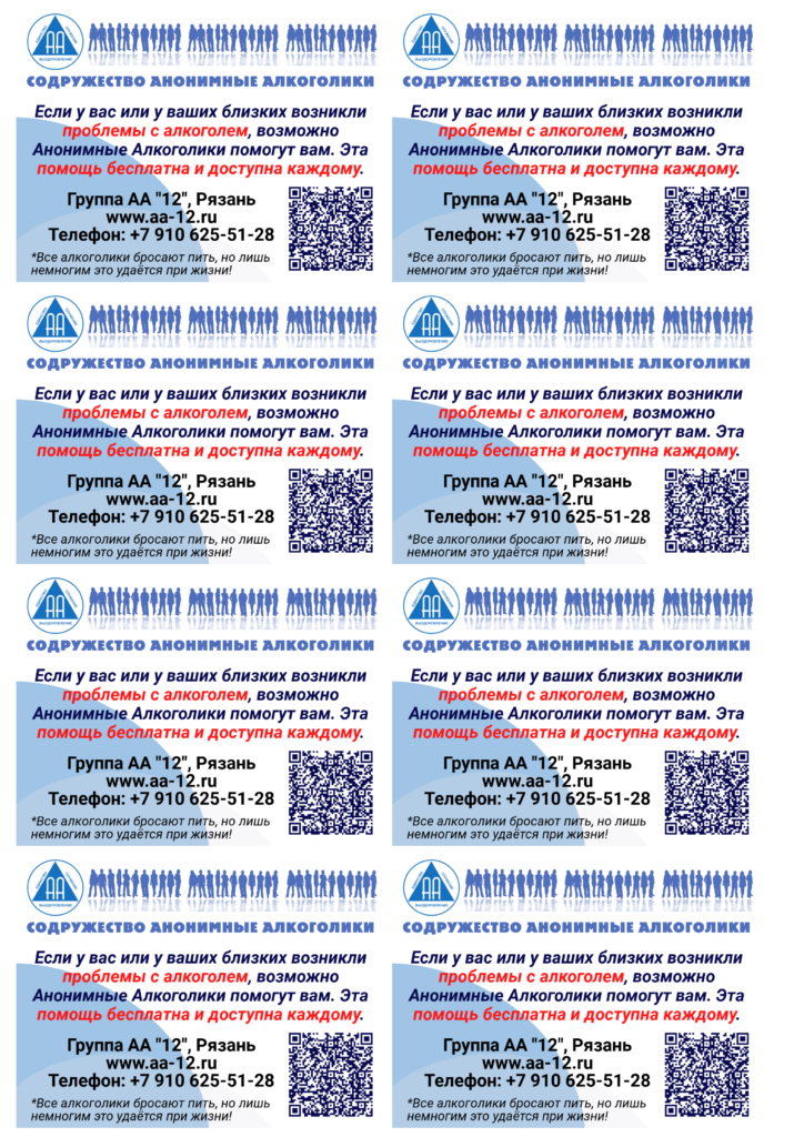Мы предлагаем варианты полиграфических материалов, стендов, визиток и другой информационной продукции для ознакомления и возможного применения в ваших группах АА.